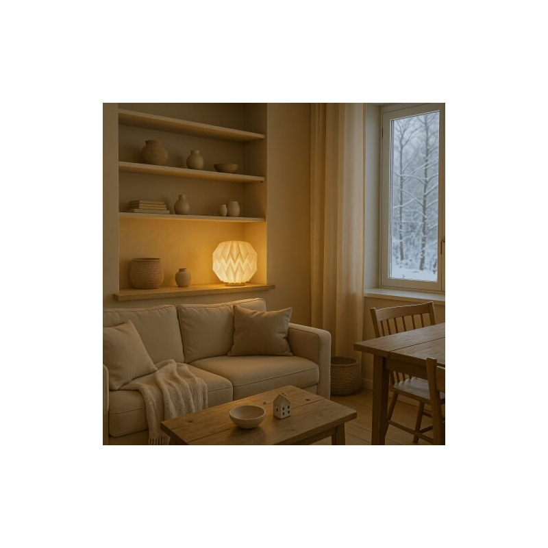 Son abat-jour en papier pliable crée un jeu subtil d’ombres et de lumières, diffusant une ambiance chaleureuse dans vos espaces.