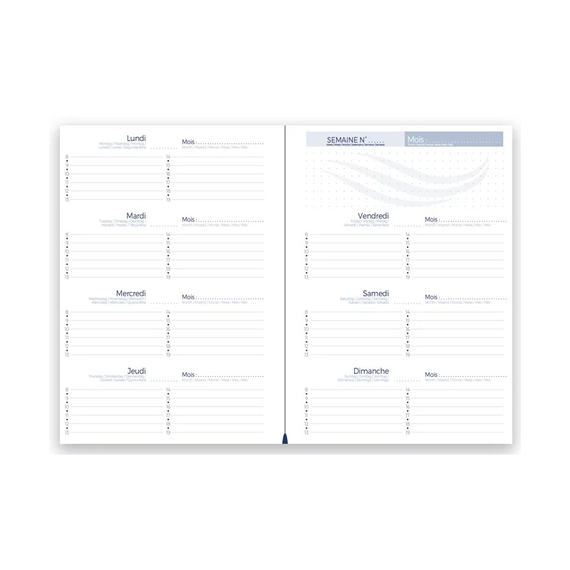 • Côté agenda : grille perpétuelle en 7 langues, imprimée en 1 couleur, 128 pages.