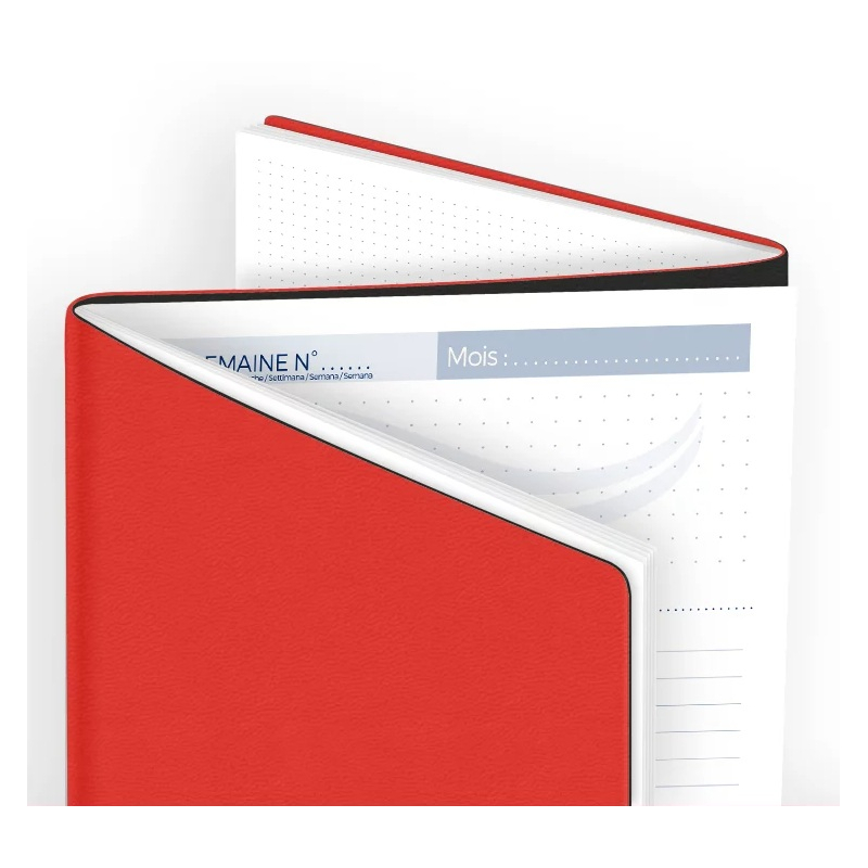 Un agenda personnalisable fabriqué en Italie, combinant pages carnet et pages agenda.