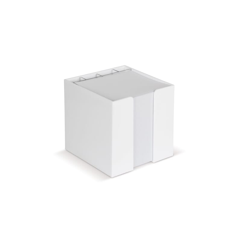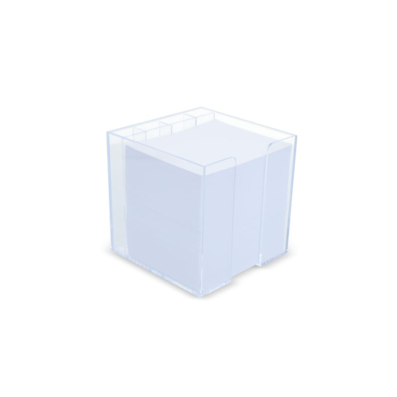 Ce bloc-notes en papier blanc, issu de forêts gérées durablement, est contenu dans une boîte cubique personnalisable dotée de quatre compartiments transparents pour organiser les articles de bureau.
