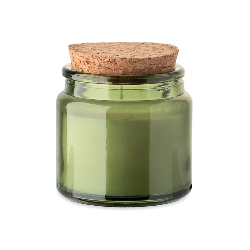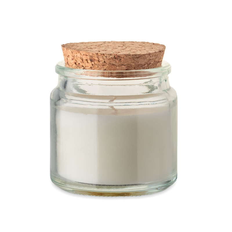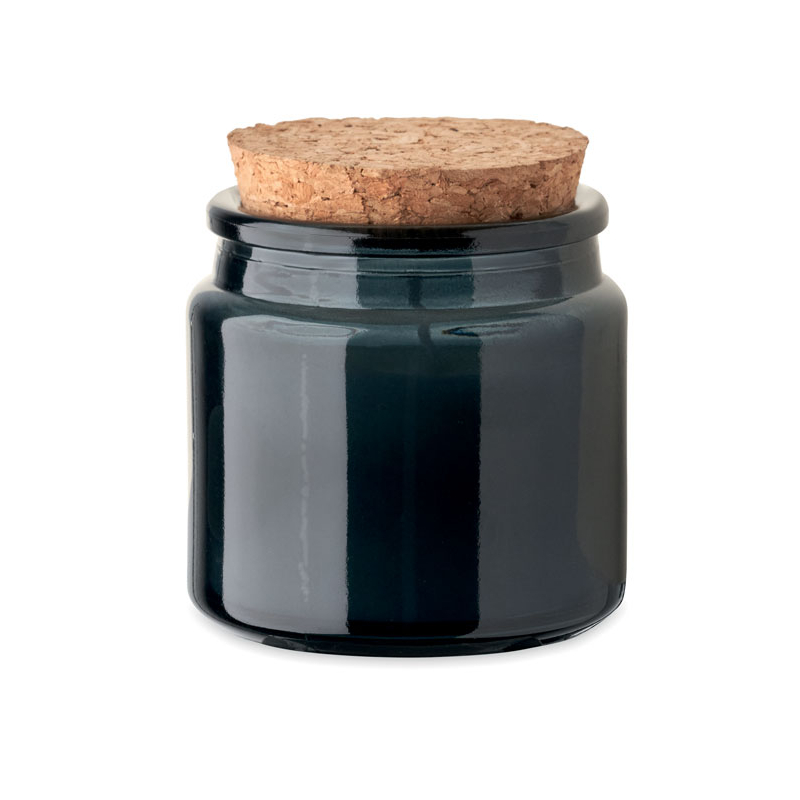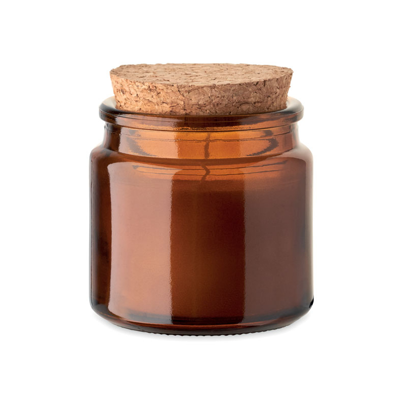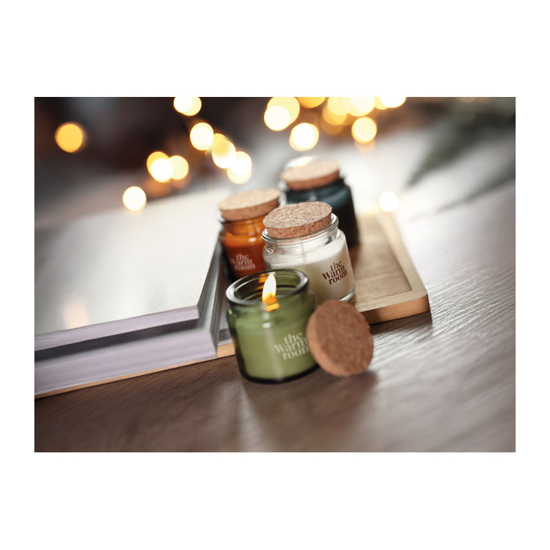 • Cire végétale parfumée vanille, pot en verre teinté, couvercle en liège.