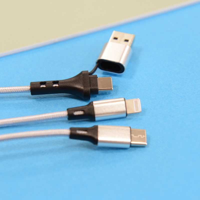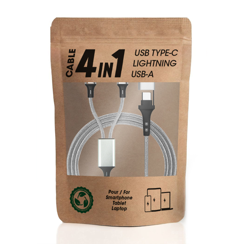 Adapté aux environnements mobiles, aux bureaux ou aux kits de cadeau d’affaires, ce câble 4 en 1 en aluminium recyclé et gaine tressée offre une solution polyvalente pour recharger différents appareils. Son format de 1,2 m facilite les branchements tout en restant simple à transporter.