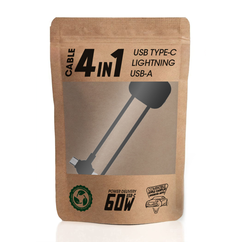Ce câble 4 en 1 combine USB-C et USB vers USB-C et Lightning pour une charge ultra-rapide jusqu’à 60 W, adaptée aux smartphones, tablettes et PC. Son format de 18 cm facilite les usages nomades et les connexions rapides au quotidien.
