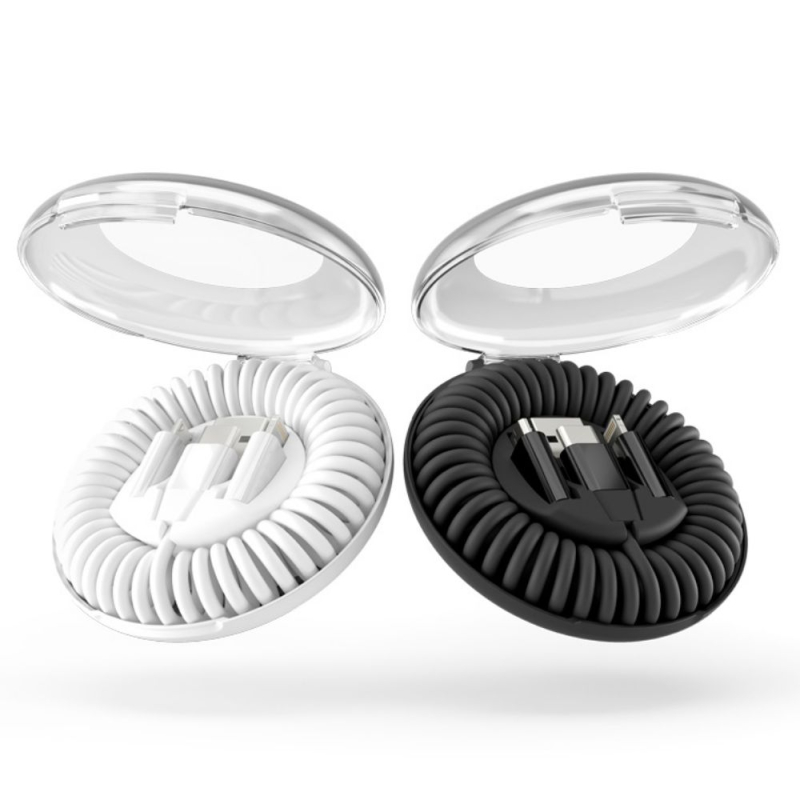 Son format avec câble spiralé extensible et adaptateurs intégrés répond aux usages variés rencontrés en déplacement, au bureau ou lors d’événements. L’étui rond facilite le rangement et la protection du câble, tout en offrant une surface visible pour la personnalisation.