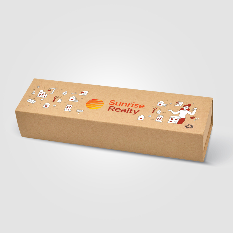 Les stylos sont fabriqués en plastique recyclé et accompagnés d’un coffret en papier kraft certifié FSC, garantissant l’origine responsable des fibres utilisées.