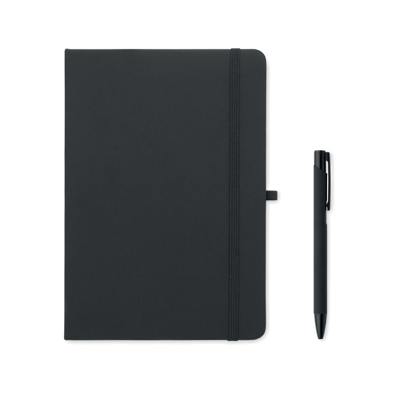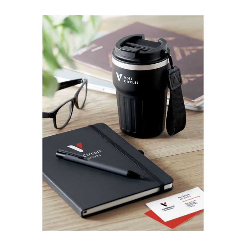 Le gobelet double paroi de 350 ml est adapté à un usage répété. Le stylo en aluminium recyclé complète le carnet A5 pour la prise de notes et les échanges professionnels.