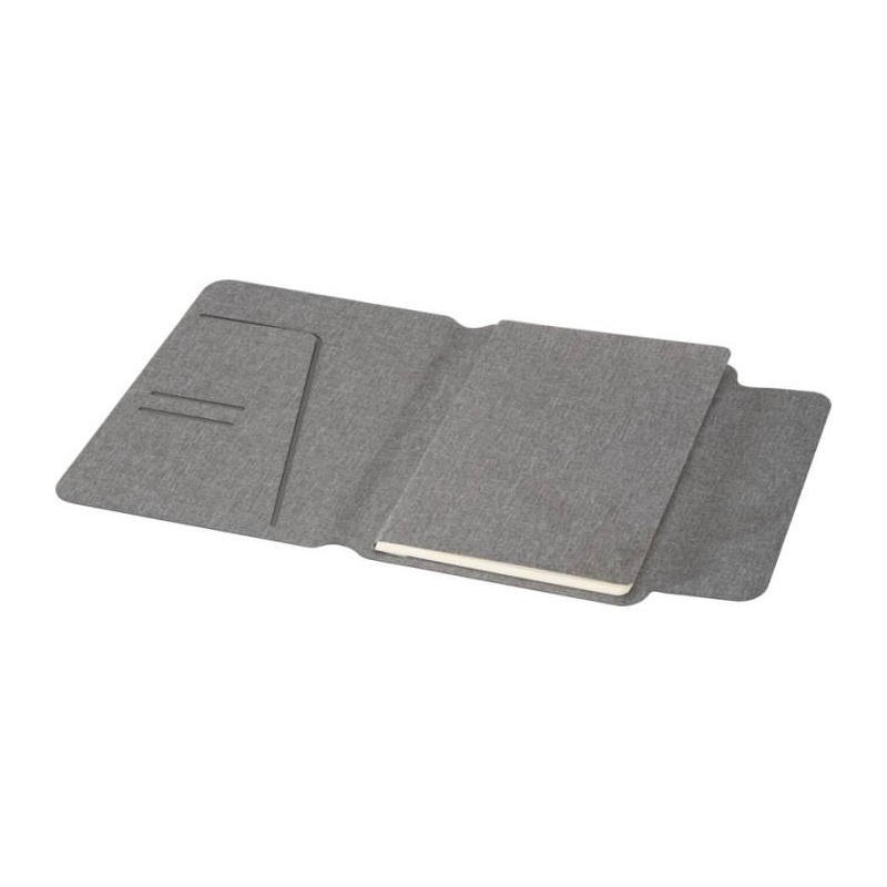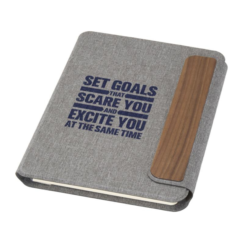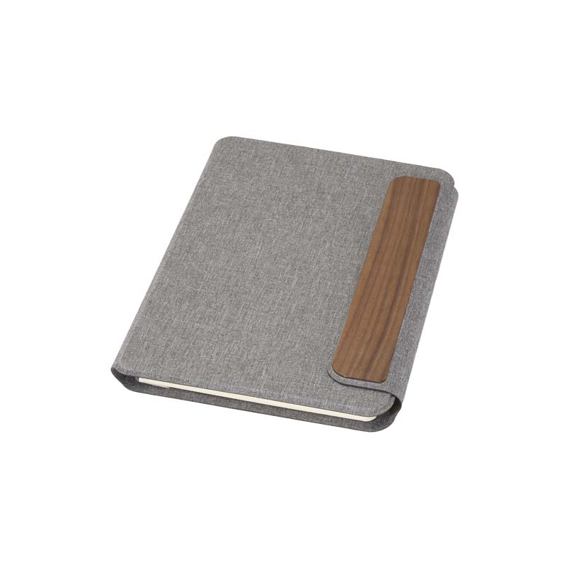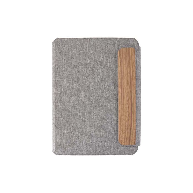 Un conférencier A5 en textile recyclé et bois à personnaliser, élégant et durable pour vos campagnes.