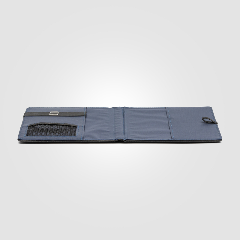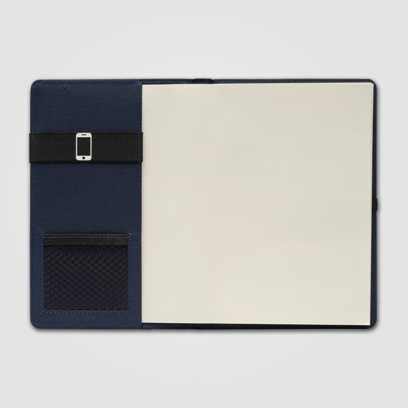 À l’intérieur, le panneau gauche en Repreve® 210D marine comprend un élastique pour smartphone et une pochette pour câbles ou accessoires. Le côté droit accueille une boucle pour stylo et un carnet rechargeable A5 de 100 feuilles (200 pages) en papier ivoire 80 g/m² ligné, parfait pour une écriture fluide et durable.