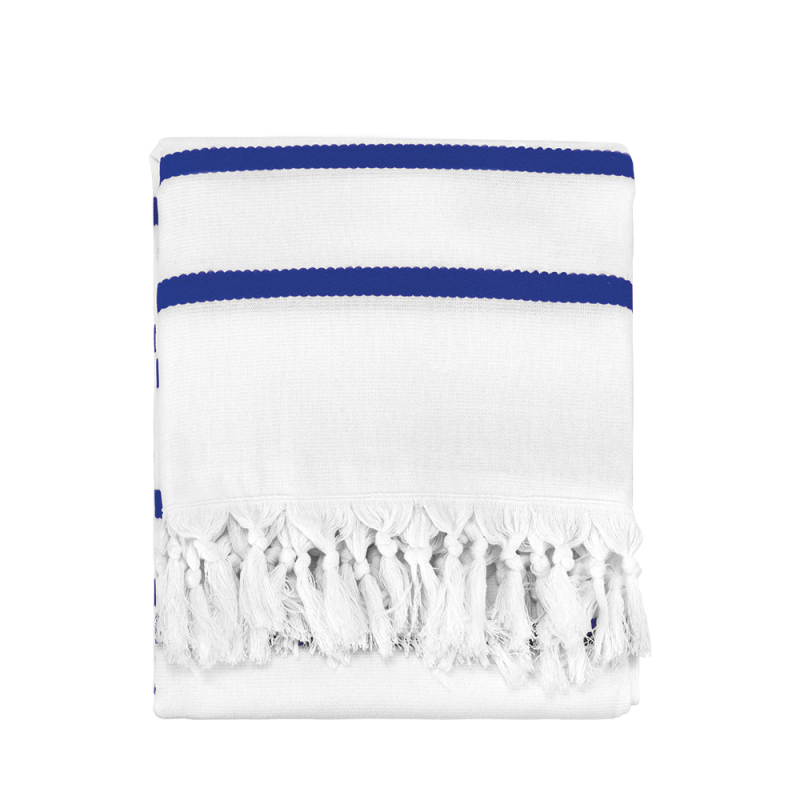 Fouta/serviette de plage promotionnelle et personnalisable de couleur gris, bleu, blanc.