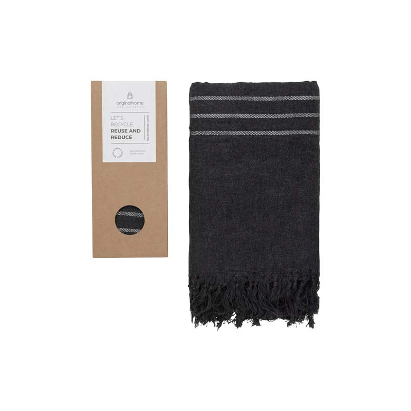 Épaisse pour être utilisée comme plaid ou serviette, suffisamment légère pour être portée comme écharpe et compacte pour les déplacements, elle s’adapte à une diversité de contextes professionnels. Fabriquée à partir de textiles 100 % recyclés issus de l’industrie de l’habillement au Bangladesh, elle est tissée sur un métier à main traditionnel afin de soutenir l’entrepreneuriat féminin local.