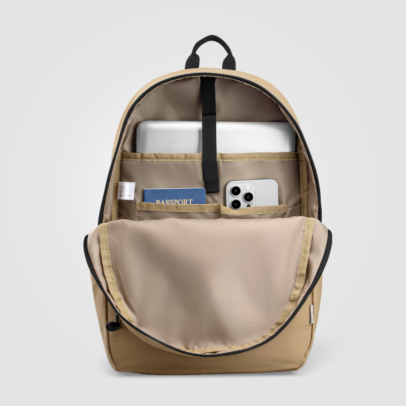 Fabriqué en nylon recyclé 320D avec doublure en polyester 210D, ce modèle allie résistance et légèreté. Son compartiment principal, accessible par double fermeture éclair, comprend une housse rembourrée adaptée aux ordinateurs portables jusqu’à 15 pouces et deux poches ouvertes.