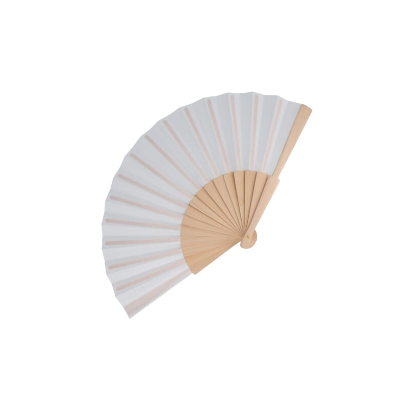 • Éventail avec branches en bois et toile en polyester recyclé.