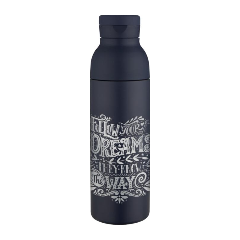 Cette bouteille est fabriquée en acier inoxydable recyclé certifié RCS, limitant le recours aux ressources vierges. L’intégration de matière recyclée participe à une utilisation plus raisonnée des matériaux dans un objet média du quotidien. Un choix pertinent pour les structures qui souhaitent valoriser des engagements clairement identifiables.