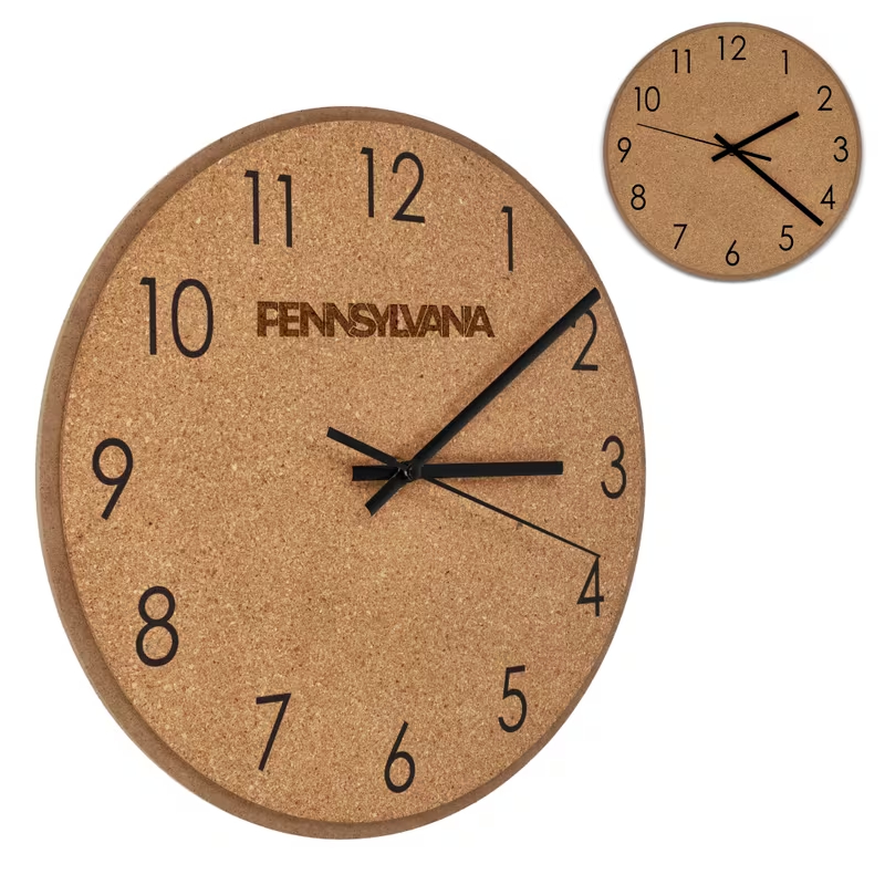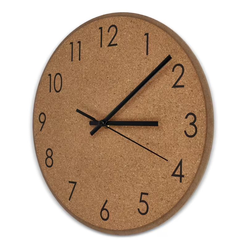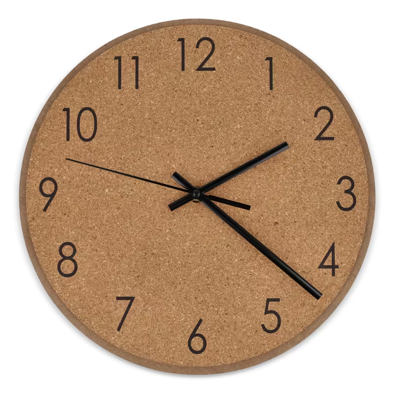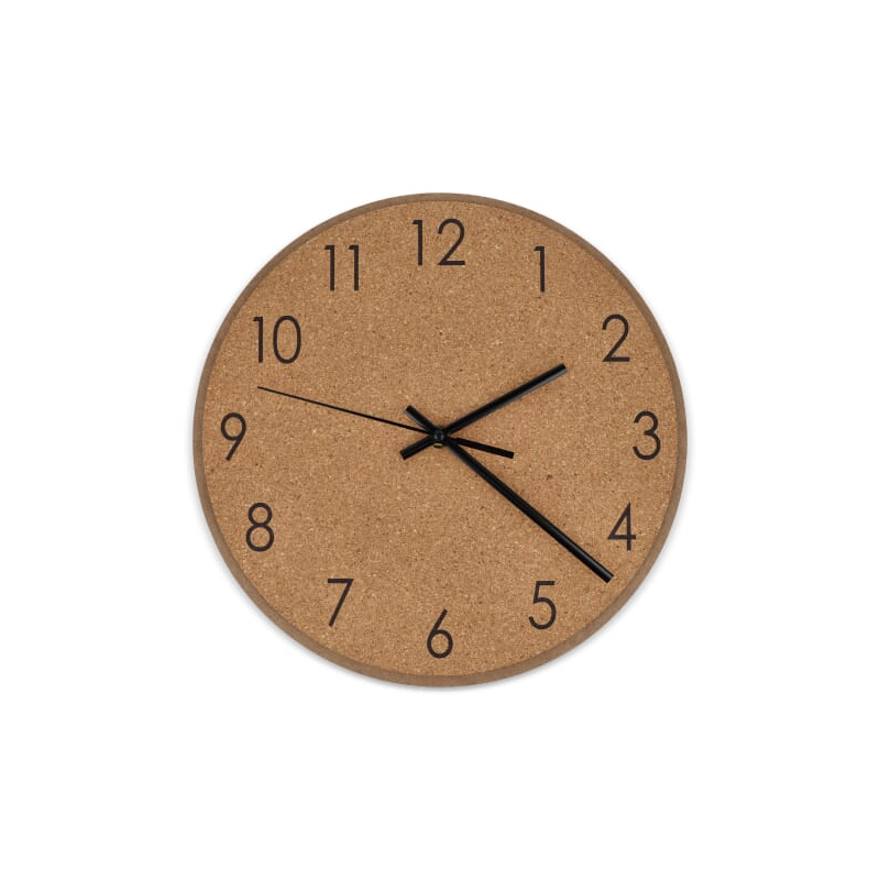 Cette horloge murale présente un cadran rond en liège, associé à des chiffres imprimés et des aiguilles noires pour une lecture claire. Son format équilibré lui permet de s’intégrer facilement dans un bureau, une salle de réunion ou un espace d’accueil.