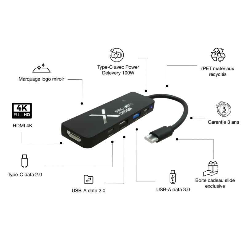 Proposé comme un objet promotionnel prémium, ce hub HDMI associe fonctionnalité, design sobre et personnalisation discrète, dans une logique de cadeau d’affaires utile et durable.