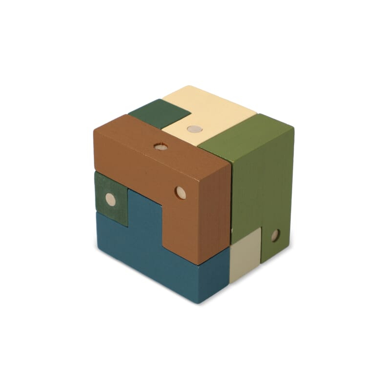 Ce puzzle se compose de pièces géométriques colorées qui s’imbriquent autour d’une goupille centrale amovible. Une fois retirée, le cube se démonte entièrement avant d’être reconstitué pièce par pièce.