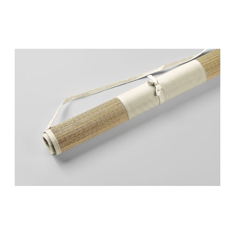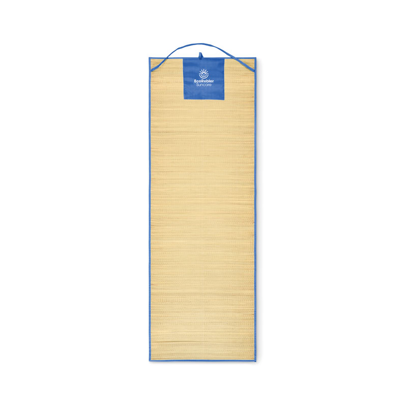 Ce tapis de plage en paille naturelle se présente sous la forme d’une surface tressée offrant une zone d’assise ou de repos déployée. Son format allongé permet une utilisation au sol dans des contextes variés, notamment lors d’événements ou d’actions de communication.