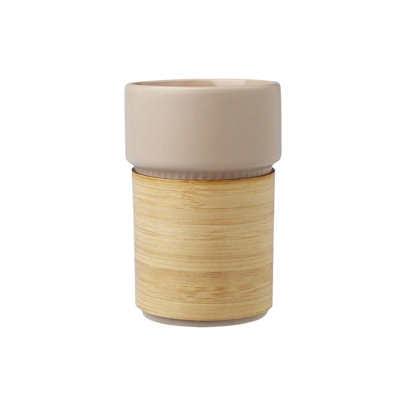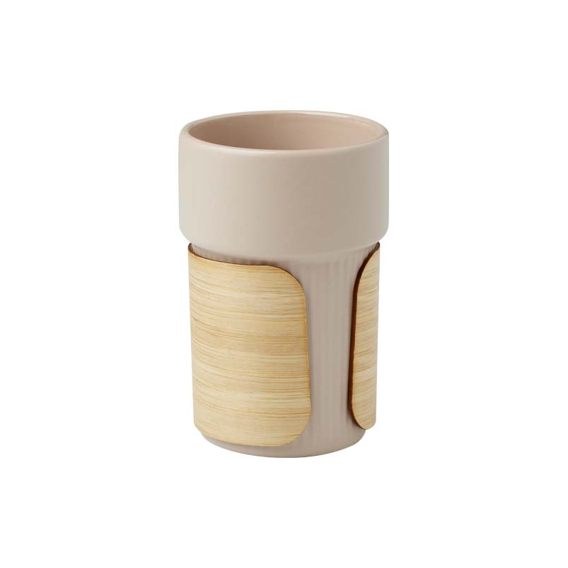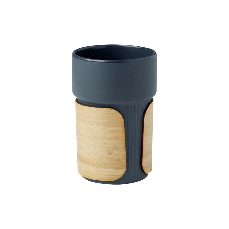 Découvrez ce gobelet promotionnel à personnaliser, élégant avec manchon amovible en bambou, idéal pour déguster vos boissons chaudes en étant protégés de la chaleur.