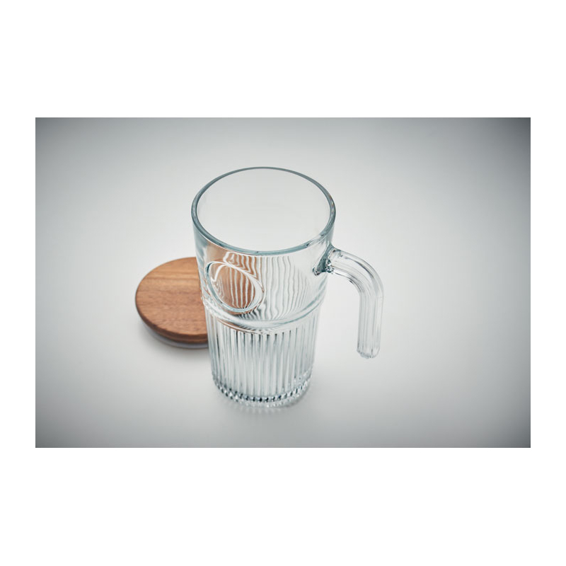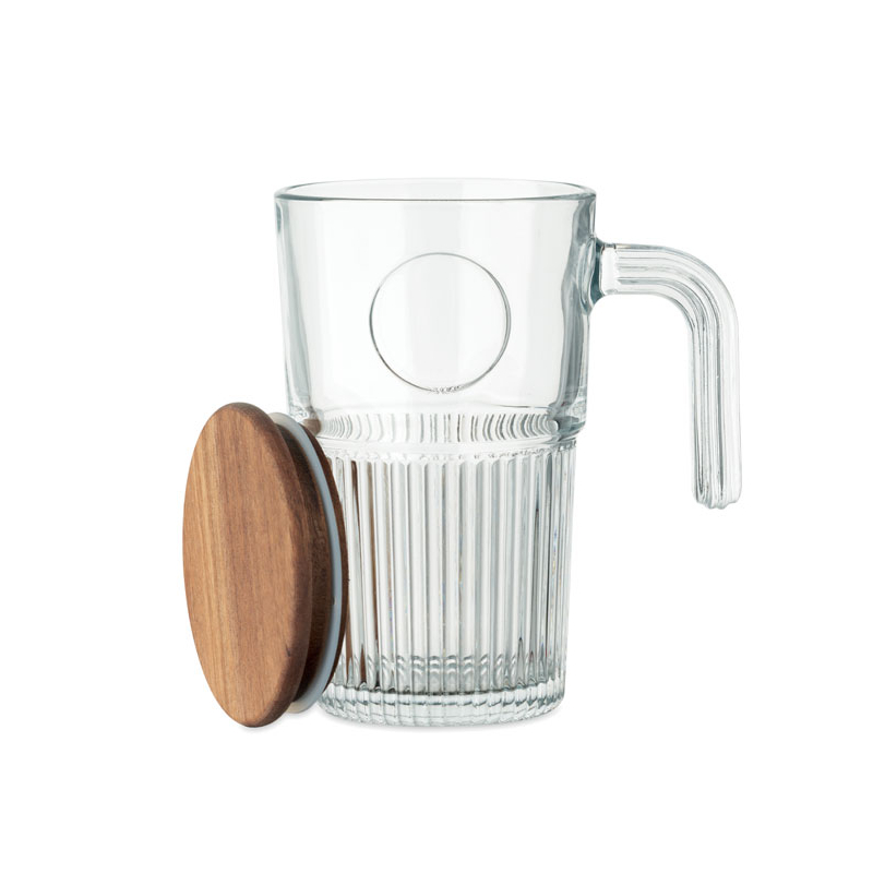 Avec son corps transparent et son couvercle en bois d’acacia, ce mug associe sobriété et usage quotidien.