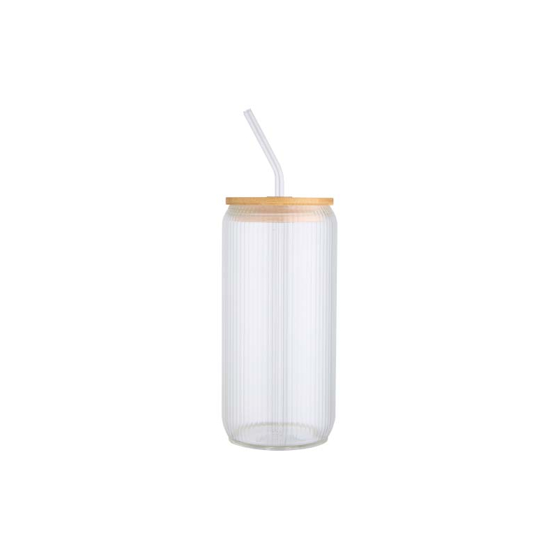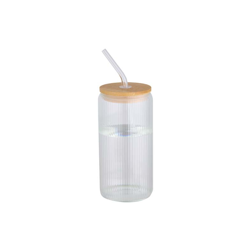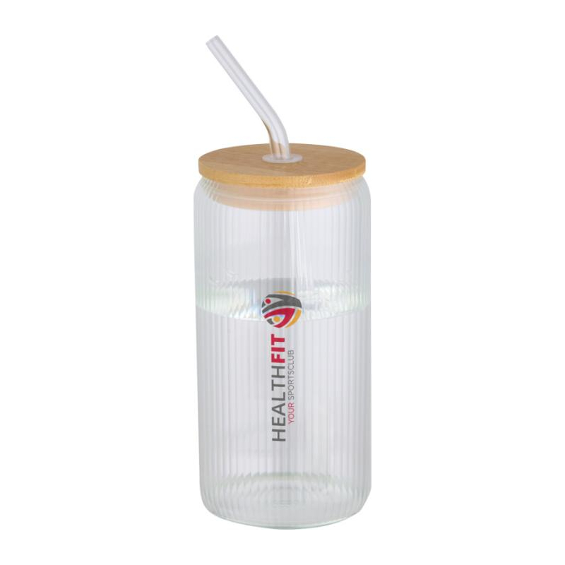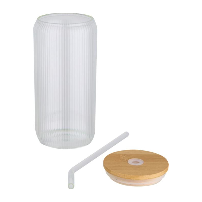 Son corps en verre borosilicate offre une bonne résistance thermique, tout en combinant un design nervuré interne et une surface extérieure lisse pour faciliter un marquage net. Le couvercle en bambou issu de ressources gérées durablement, associé à la paille en verre incluse, apporte une touche naturelle appréciée dans les environnements professionnels sensibles aux engagements responsables.