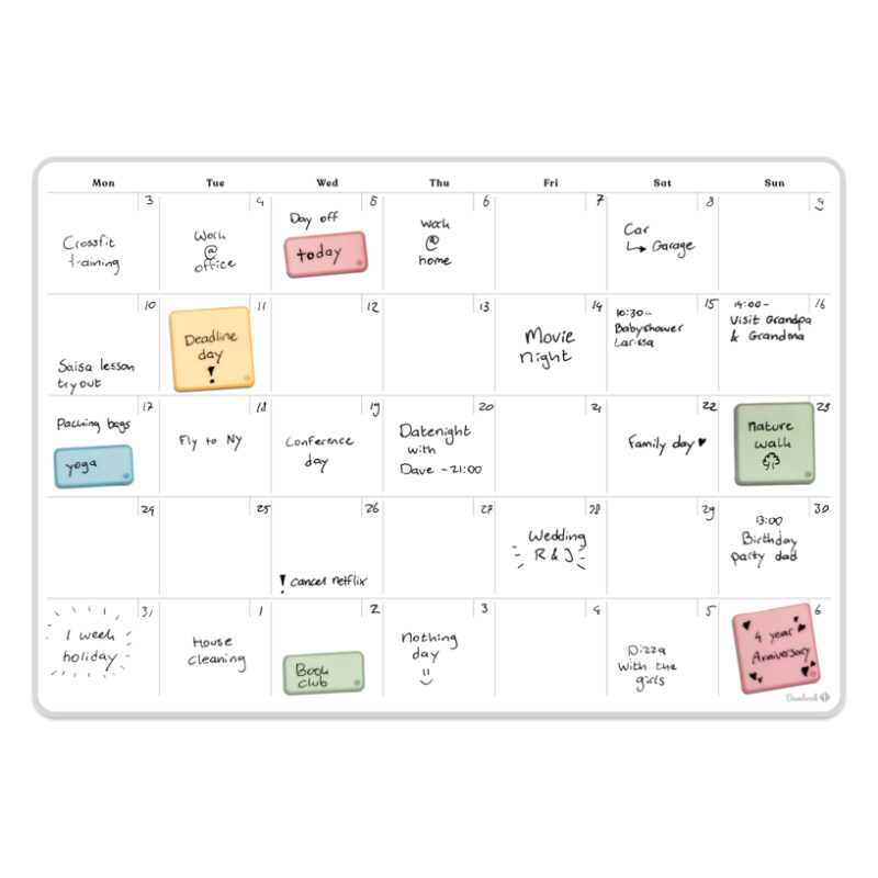 Auto-adhésif, repositionnable et réutilisable, il se colle sur toutes les surfaces lisses sans perçage et se déplace facilement selon les besoins. Il remplace efficacement les calendriers papier à usage unique et s’inscrit dans une démarche d’organisation durable.