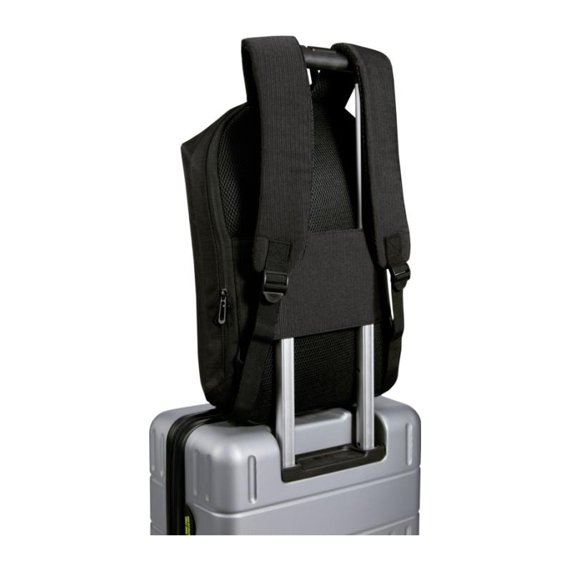 Fabriqué en polyester jacquard recyclé certifié GRS avec doublure RPET, il associe durabilité et finition soignée. Son système antivol repose sur des fermetures zippées verrouillables (cadenas non inclus) et une poche arrière discrète faisant office de passant pour bagage. Le tissu déperlant offre une protection adaptée lors de faibles intempéries.