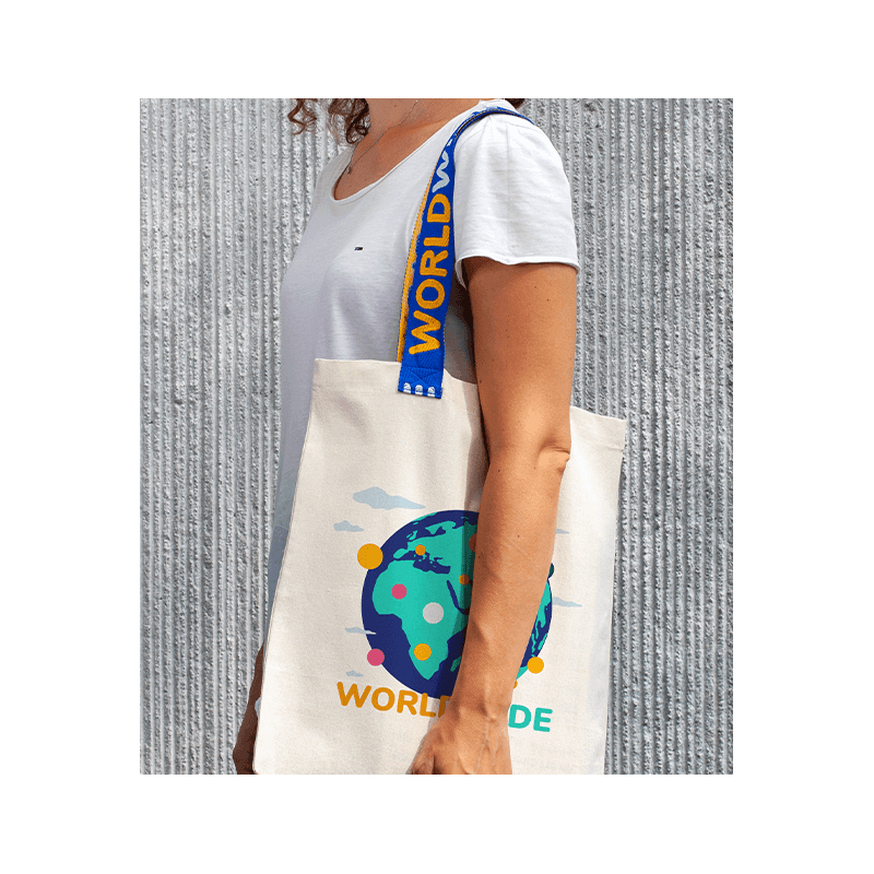 Décliné en trois grammages — léger, intermédiaire ou renforcé — il permet de répondre à des besoins variés, de la distribution en volume aux dotations plus premium. Les poignées jacquard larges de 4 cm apportent une signature esthétique forte et facilement identifiable.