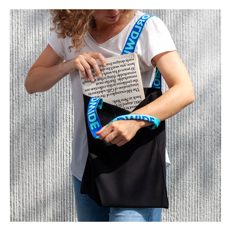Avec son format 38 × 42 cm, il s’adapte naturellement aux attentes du retail, des événements professionnels ou des déplacements du quotidien. Son textile recyclé, mêlant 80 % coton et 20 % polyester, offre un support résistant et respirant, pensé pour des campagnes attentives à la durabilité.