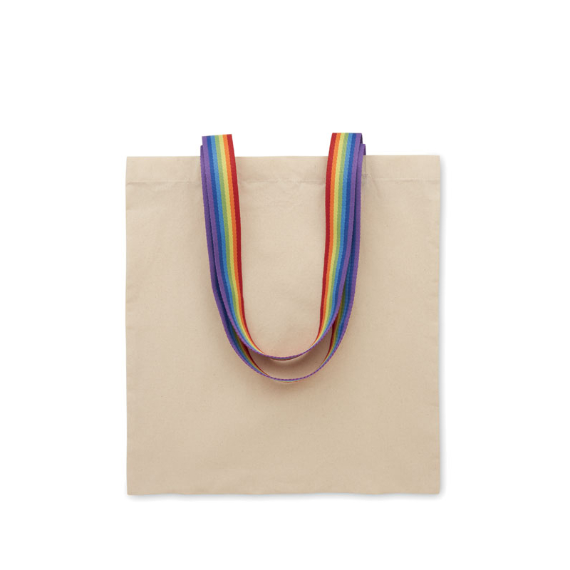 Confectionné en coton 180 g/m², ce sac shopping au format 38 x 42 cm accompagne salons, opérations commerciales ou campagnes institutionnelles. Ses anses longues aux couleurs arc-en-ciel apportent une touche distinctive tout en facilitant le porté à l’épaule.