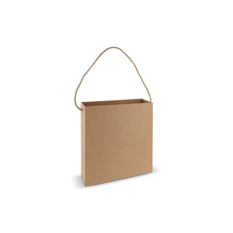 De forme verticale offrant un transport stable à vos produits, et muni de poignées en jute naturel, le sac en carton rigide devient un emballage durable, authentique et solide.